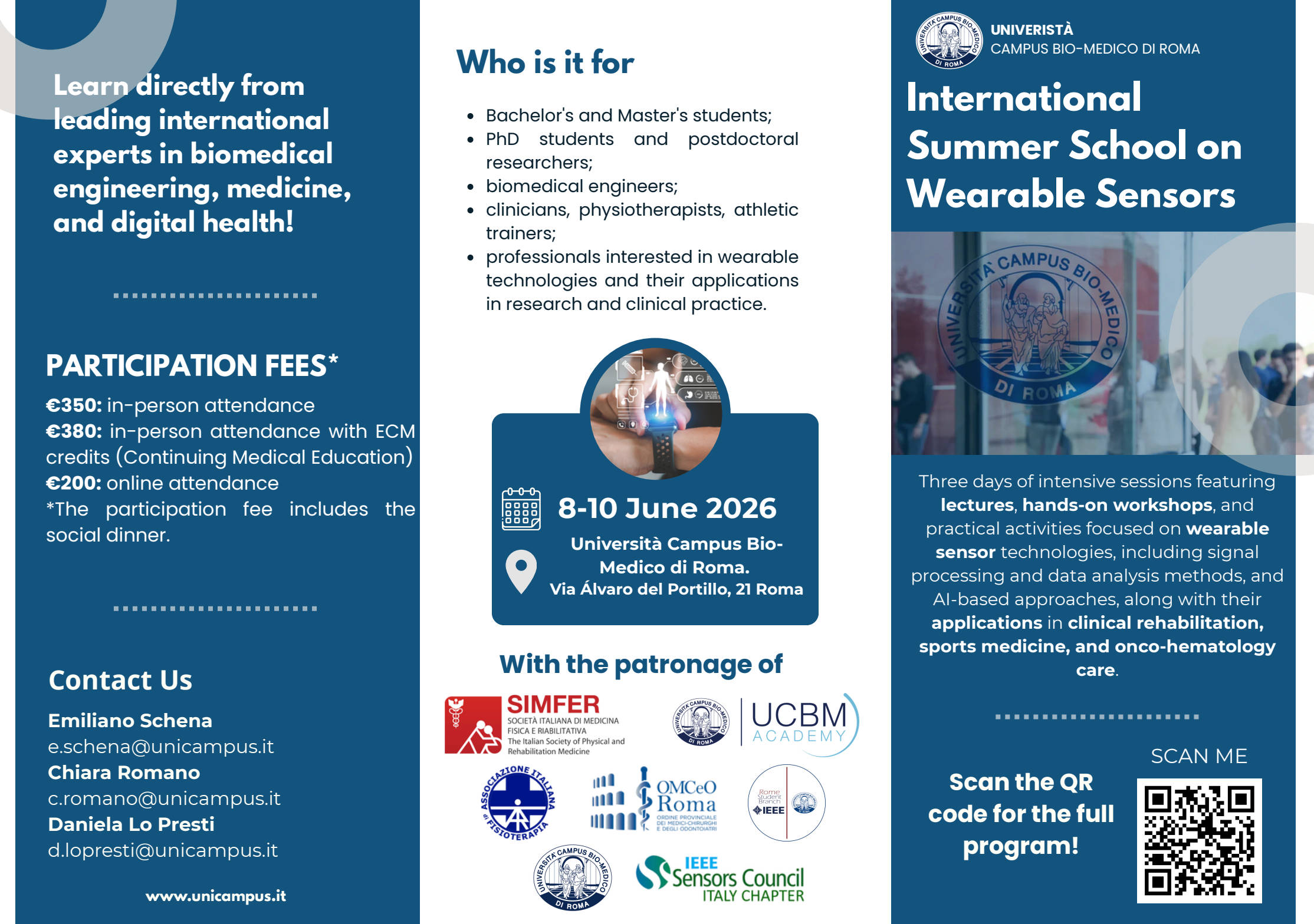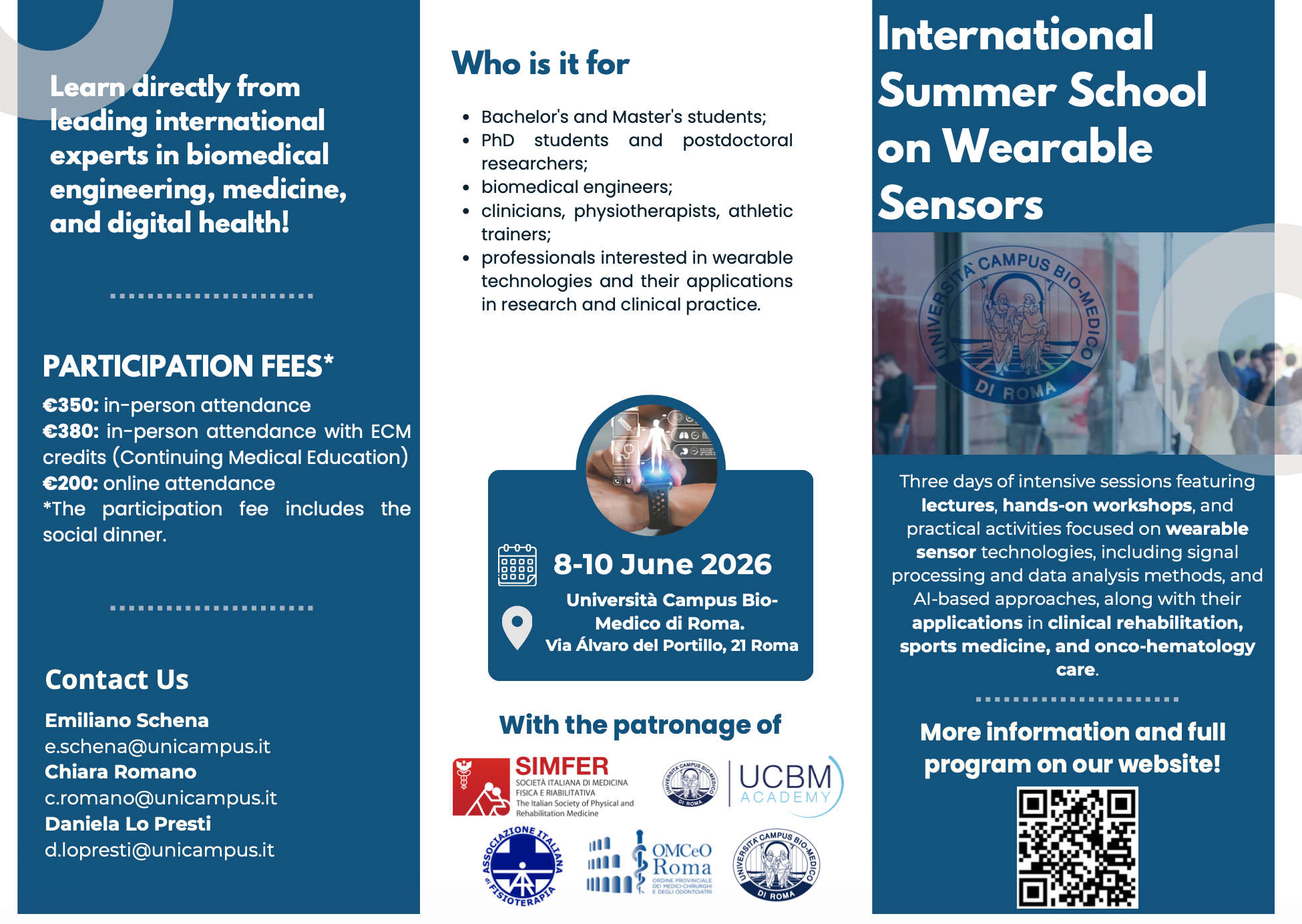 The Summer School is open to Bachelor's and Master's students, PhD candidates, postdoctoral researchers, biomedical engineers, clinicians, physiotherapists, athletic trainers, and professionals interested in wearable technologies and their applications in research and clinical practice.
